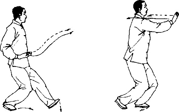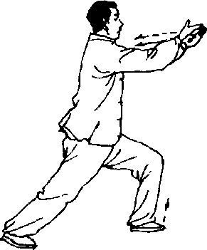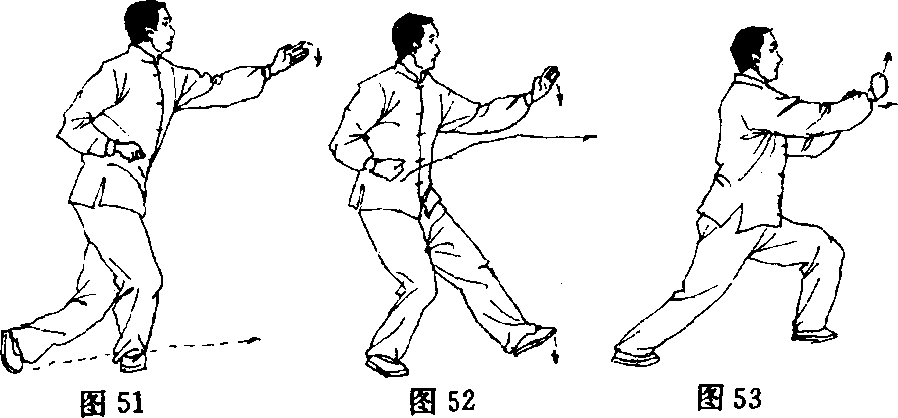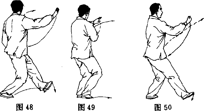 (4) 重心前移,上体右转;右前臂内旋,右拳向右划弧至体侧, 左前臂外旋,左手向左、向前划弧至体前;眼视左手(图51)。