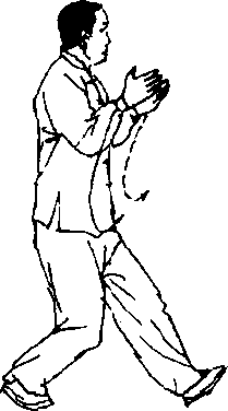 【要点】此动作要注意跟脚的时机,就是在两手向上向前推 按时,左脚跟至右脚侧后方,这样上下肢就能协调完成好定势动 作。
