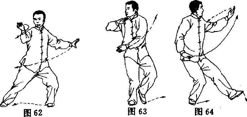 (1) 重心左移,右脚尖内扣,上体稍左转;右前臂外旋,掌心转 向上,右手向内掩裹划弧至右肩前,左手向左、向下划弧;眼视右掌 (图 62)。