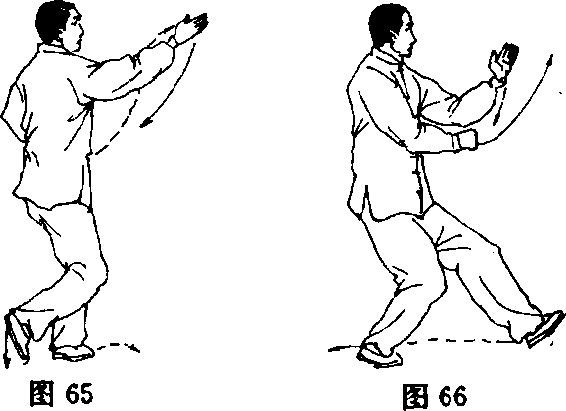(4) 上体继续左转,重心前移,右脚前跟半步,前脚拿落在左脚 后面;左臂内旋,掌心转向外,左掌向左、向下划弧至体左侧;右臂 外旋,右掌向右、向前划弧至体前,高与头齐,掌心斜向上;眼视前 方(图65)。