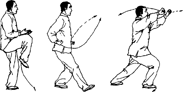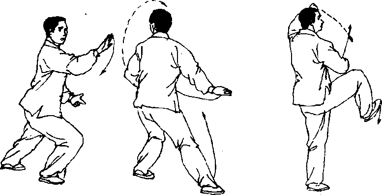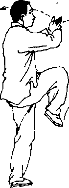 【要点】 强调重心移向左腿屈膝的同时,右脚尖内扣动作;左 拳经体侧屈臂上举时,要有一向上的撑劲,这样独立时才能站得 稳.