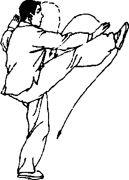 (2) 右脚脚面展平,脚尖向右前上方慢慢踢出,高过腰部:两掌 同时向右前方和左方划弧分开,掌心皆向外,指尖向上,腕同肩高, 两臂撑举,肘关节微屈,右臂与右腿上下相对;眼视右掌(图125)。