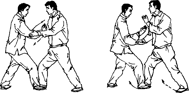 甲右脚后撤步,重心偏于右腿,上体稍左转,右手脱开乙右手 的采按扶于乙左肘部,用两手向头部左前侧引化乙左手来劲,使其 落空;乙左脚向前上步至甲左脚内侧,重心前移,左腿屈膝前弓,右 手扶于甲左肘部(图67)。