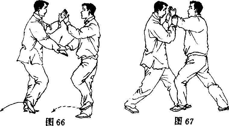 乙重心前移至右腿,左脚提起,右手仍采按甲右手腕,左拿向 甲面部伸插;甲重心后移至左腿,右脚提起,左掌承接乙左学采势; 甲乙双方左手腕交叉相搭(图66)。