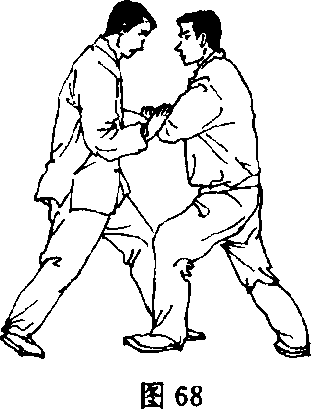 甲顺势将右掌粘贴在乙左手腕上,向下循弧线切按,同时右手 向下按乙左肘,重心前移,左腿屈膝前弓,用左掌指尖向前伸插乙 腹部;乙以左手用搠劲承接甲来劲,左臂顺势后收,重心后移,上体 左转,将甲左手引向左腹前,使其落空,右手扶于甲左肘部(图68、 69)。