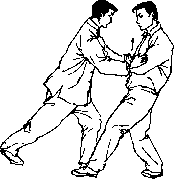 甲两手向下、向前推按;乙以右臂用棚劲承接甲按劲,左手扶 于甲右肘部,重心后移,向后引化(图64)。