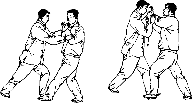 乙随势将左手循弧线上提至左肩前侧,用左掌指向甲面部伸 插,甲顺势重心后移,右腿屈膝,上体左转,两手掌将乙左手向头部 之前侧引化,使其落空(图70、71)。