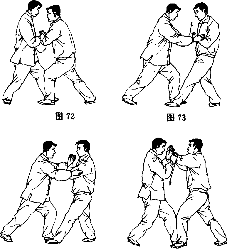插;甲顺势重心后移,上体左转,将乙左手引向头部左前侧,使其落 空,双方右手扶于对方左肘部(图74、75)。