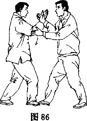 乙右手内旋循弧线上提向甲面部伸插,重心前移,右腿前弓; 甲随势重心后移,左腿屈膝,以右手桐劲承接乙右臂,上体右转,右 臂外旋屈肘,右手掌心向上,手背贴在乙右手腕上,向下循弧线沉 压乙右手至腹前,双方左手均扶于对方右肘处(图86.87).