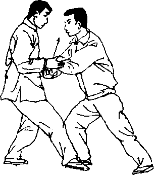 甲右脚向后撤步,重心移向右腿,屈膝;乙左脚向前上步至甲 左脚内侧,重心移至左腿,屈膝前弓;同时两臂内旋,以掌腕向内、 向下翻压甲前臂于腹前;甲两臂亦顺势内旋向下粘随乙臂于腹前 (图 91 )0