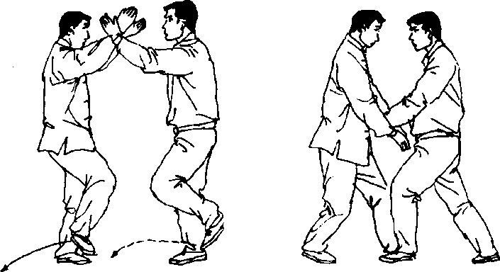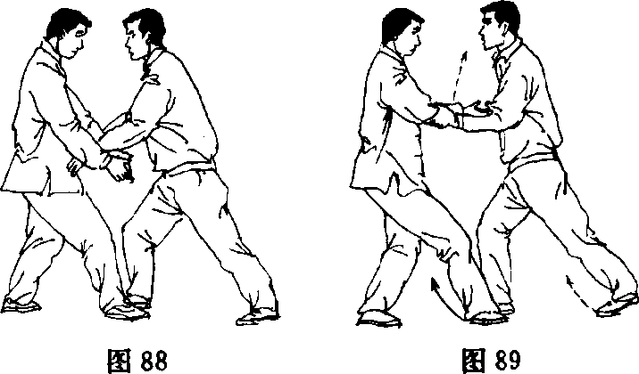 乙重心移至右腿,左脚提起,两臂继续向上、向内以手腕为粘 接点捧合甲前臂于面部前方,掌心斜相对;甲重心移至左腿,右脚 提起,两臂亦粘随乙臂向上、向内合,掌心斜相对(图90)。
