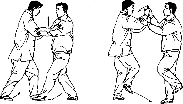 乙重心移至右脚,左脚提起,两手向上、向右棚起甲右臂;同 时,甲随势重心移至左腿,右腿提起,两手粘随乙左臂形成双糊势 (图 169)。