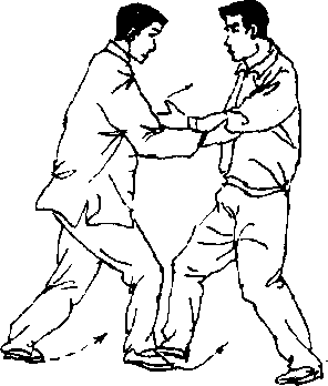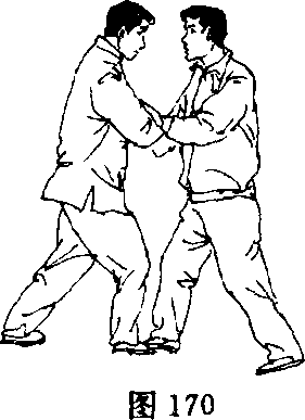 乙左脚向后撤步;甲右脚向前上步落于乙右脚内侧,左手脱开 乙右肘扶于右臂内侧,上体稍右转,用右前臂向右、向下、向前平挤 乙胸部;乙顺势重心后移,两手向下按甲右臂(图170)。