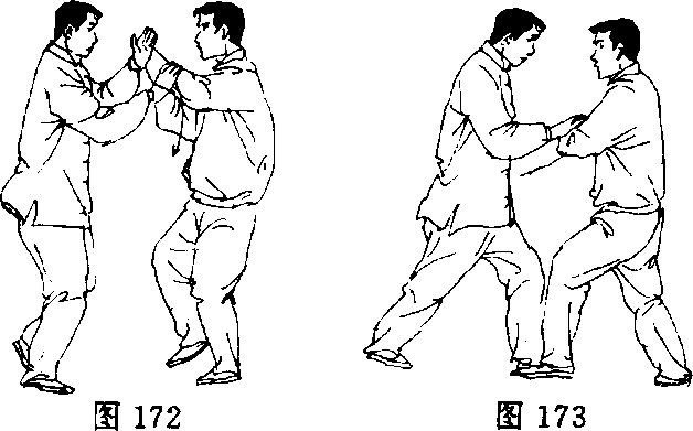 甲重心移至右腿,左脚提起,两手向上、向左捆起乙左臂;乙随 势重心移至左腿,右脚提起,两手粘随甲左臂,形成双棚势(图 172)。