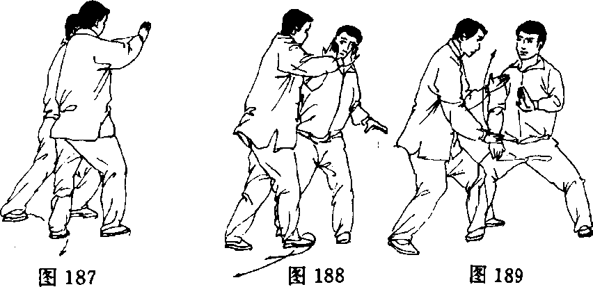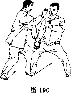 甲右脚I向右后撤步,重心下降成半马步,捋乙右臂;乙顺势右 卿向前上步,落于甲左腿内侧,成半马步,同时右臂内旋下落,用肩 臂靠击甲胸部,左手置于右臂内侧;甲左前臂内旋化开乙靠劲,右 手下采乙右手腕(图189)。