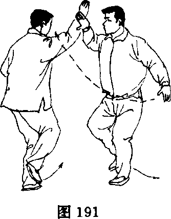 甲左脚向右后撤步,两手继续向右捋乙右臂,乙顺甲捋势左脚 向前上步,重心偏于左腿(图188)。