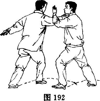 乙右脚向左后撤步,重心偏于右腿,左前臂贴靠甲右时部,右 手继续向右捋甲右臂,甲顺捋势右脚向前上步,落于乙左脚内侧 (图 192)。
