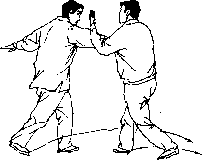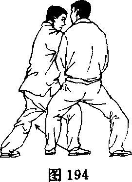 乙右脚向右后撤步成半马步,两手继续捋甲右臂;甲顺乙捋势 右脚向前上步,落于乙左腿内侧成半马步,右臂内旋下落用肩臂靠 击乙胸部,左手扶于右大臂内侧,乙左前臂内旋化开甲靠劲,右手 下采甲右手腕(图194)0