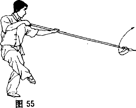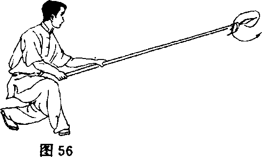 (2)左腿屈蹲,右脚外摆向前盖步;同时,两手握枪右旋使枪尖 向左向上绕立圆圈,两手握枪于腹前(左手掌心朝下),枪尖同头 高;眼视枪尖(图56)。