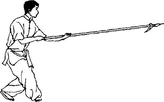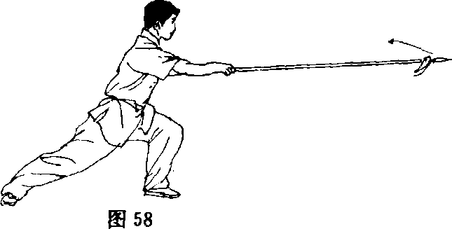 两腿伸起,两手握枪使枪向右向上做圈枪动作;接着右脚后 撤,左腿屈膝成左弓步;两手握枪右臂前伸向前平扎枪;眼视枪尖 (图 57、58)。