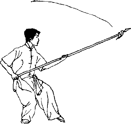 (1) 重心移至右腿,并屈蹲,左脚蹬地并后收,左脚尖点地成左 虚步,上体右转;同时,右手握枪把向后抽枪至右腰间,左手掌心朝 上滑握枪中段向斜上端枪,枪尖同头高;眼视枪尖(图59)。