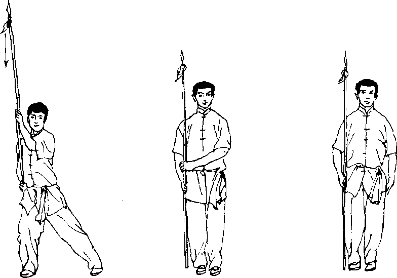 【要点】(1)动作为虚步抽枪,动作要轻灵、柔和稍顿;(2)(3) 动作要连贯、一气呵成;持枪并步站立,仍要精神贯注,气质饱满, 立身中正。