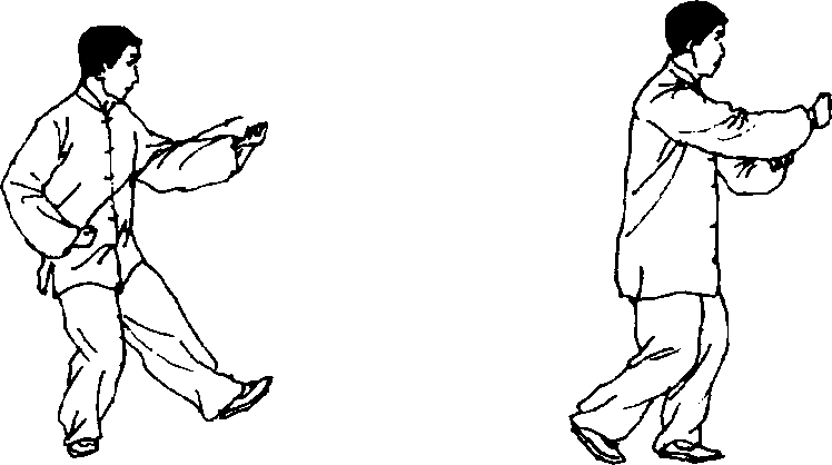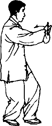 (1) 重心后移至右腿并屈蹲,右脚踏实,左脚跟抬起;两拳变掌 手腕相交叉,左手在外,两掌心均向里;眼看前方(图27)。