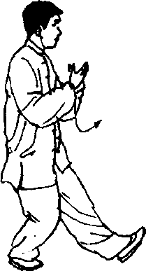 左脚向前上步,脚跟着地;同时上体微右转,左 掌内旋,掌心翻向下,掌横按于体前,与胸同高;右掌变拳收于腰 间,拳心向上;眼看左手(图25)。
