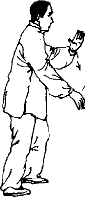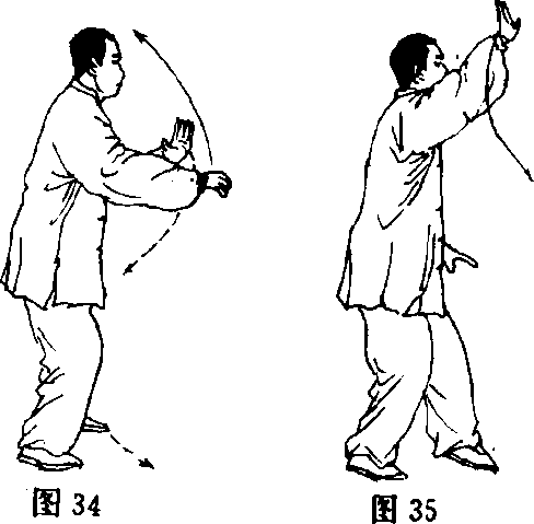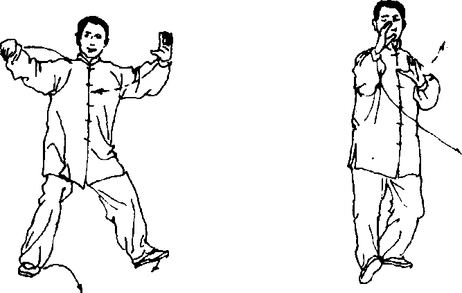 【要点】 在移动身体重心时,上体要平稳,敛臀;在右脚跟着 地时,右膝微屈;两肩放松下沉,两臂微屈,肘尖下垂。