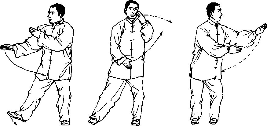 【要点】身体转动要以腰为轴,松腰,松胯,不可忽高忽低;两 臂随腰的转动而运转,要自然圆活,速度要缓慢均匀,下肢移动时, 身体重心要稳定。