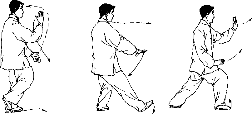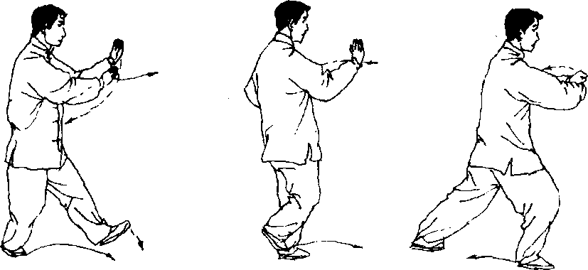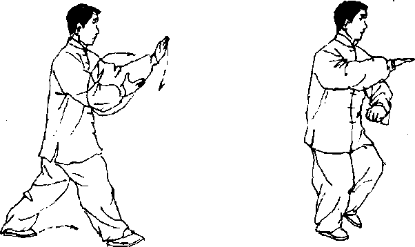 (7) 上动不停,右脚向右前(东)迈出,脚踉着地,两腿右虚左 实;左手向上向后划弧提至左耳侧,掌心向右前下方;右手经左前