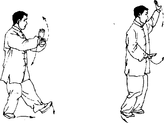 (1) 右脚以前脚掌为轴,脚跟向外碾转,上体微左转,左手下落 至胸前,右手向左划弧,掌心朝里;眼看左手(图39)。