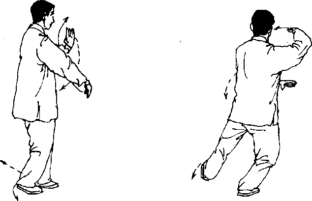 (1) 重心移至右腿并屈蹲,左曲向左前方迈出,脚跟着地;同时 上体微右转,两臂在胸前交叉,右臂在上,左臂在下,两掌心左右斜 朝下,眼看右前方(图37)。