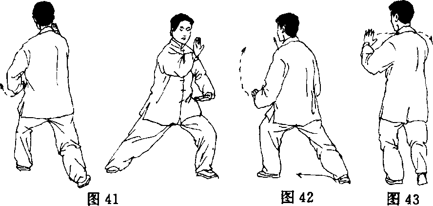 (3) 左脚落平,重心移向左腿,屈膝前弓成左弓步;上体继续左 转;左手向左弧形平搂至左腹前,掌心翻向上,指尖向右;右手由右 耳侧向前推出,掌心朝前,指尖向上,同鼻高;眼看右手(图41为正 面、背面)。