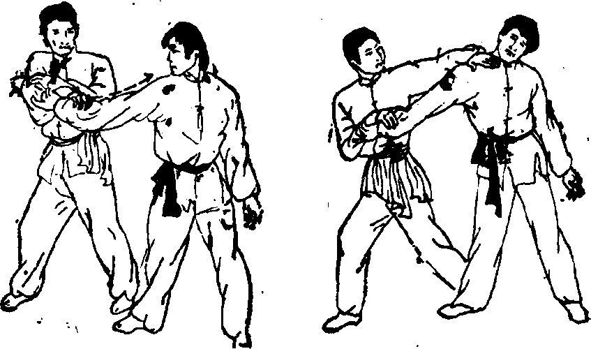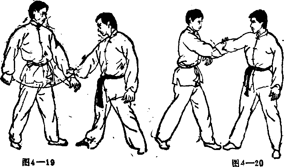 动作要领,(O我向前行走的过程中,左手腕突然由前被敌方抓住< 图 4—19)。(2 )左小臂上提,右臂迅速经敌右臂下方向右穿过(图4—20 ) o(3)身体右转,同时右手由上向右下以掌外沿为力点 切压敌腕部(图4一21 ) .(4)右手顺势抓敌腕部或小臂,身体重心右移,同时事 左掌以掌外沿为力点猛力向前横砍敌颈右侧(@4-22 ) ?图 4一21 图 4一22要求8转身、切腕要协调,横砍敌颈要快。说明,左掌横砍敌颈时,也可变为以掌背为力点甩击敌 面部。攻击部位可根据敌方姿势变化而定。