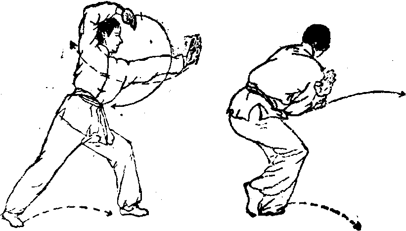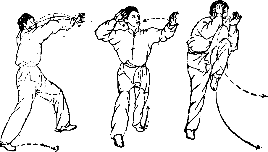 实战说明,它是菽动防守的一种姿势。在实战中如果遇 敌乱拳乱牌猛力攻击时,我在采取这一防守动作防护同时, 快速探明敌空隙.以发动突然反击。