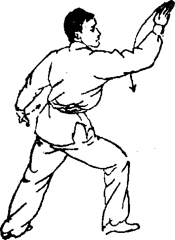 (2)上动不停,身体右转,同时左掌掌心向下以指尖 为力点伸臂向前插出(图6—41 ) o