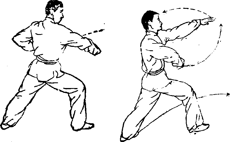 (2)右脚向前上步成右弓步,同时右臂由下向前上、