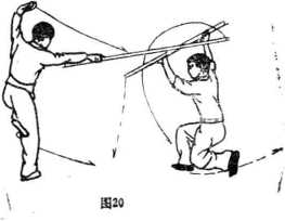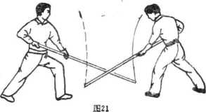 甲当乙撤步下跪,以 棍身上架时,即左足上步, 成左弓步。同时左手接住 棍身,双手持棍,使棍头 向左、向下弧形绕动,斜 击乙之右足踝(图21 )。
