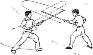 乙当甲独立,以棍头向头顶抡劈时,速左足后撤,贴右 足根而下跪。同时双手握棍上举,以棍身横架甲之棍头(图