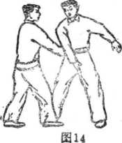乙当甲右掌向己颈部劈来时,急向左拧腰闪身,同时以 右掌往左劈挂开甲右掌(图14) o