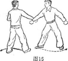 甲当乙以右掌劈挂时,顺乙右掌劈挂之势,沾粘乙右前 臂,而劲孤形往下往左划开,同时向左转身(图15)。