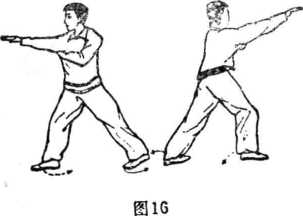 甲、乙二人同 时乘势向左后转身, 上右步,穿右掌(图 16)o