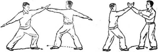 甲、乙二人同时上右步,穿右掌,成右交手式(图18).