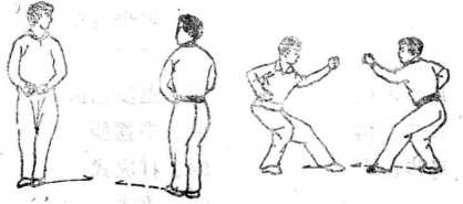 甲、乙二人相距约两步,各成立正姿势,方向相反。各 以左侧相对,目光对视。双手握拳,拳心向下,置于小腹 前,双臂略曲(图1 )。