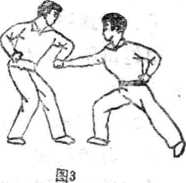 乙上右步成右弓步,同时以右拳平击(拳背朝上,下 同)甲左胁部,左拳收左腰(图3)。