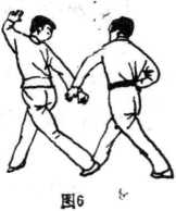 乙当甲上步撩阴时,即速退左步,向左转身,让开甲 掌。同时以左掌掌背部,向左搭开甲掌(图6 )。