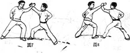 甲当左劈拳被乙右手捋化开时,速上右足成右弓步。同 时举起右拳,由上向前、向下劈击乙头部。左拳收腰间(图8)。