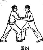 右腕翻转,反采并切压住甲右腕部,左掌托住甲右肘部,用 同样方式,发劲将甲推出(图24)。