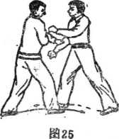 乙当甲左掌推来时,即时松开右臂,同时用左手自上往 右往下往左,搂挂开甲左掌(图25)。